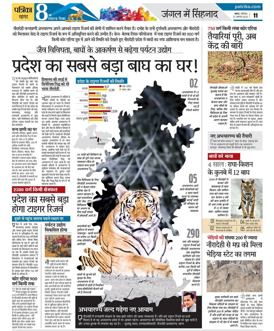 Nauradehi Wildlife Sanctuary is ready to get upgraded to Tiger Reserve. Nauradehi and Rani Durgavati Sanctuary, Damoh in combined form are expected to be notified as New Tiger Reserve by the Centre. Keeping in view the possible submergence of 900 sq km core area of Panna Tiger Reserve because of the Ken-Betwa link project, Nauradehi can become a new home of tigers in the state.